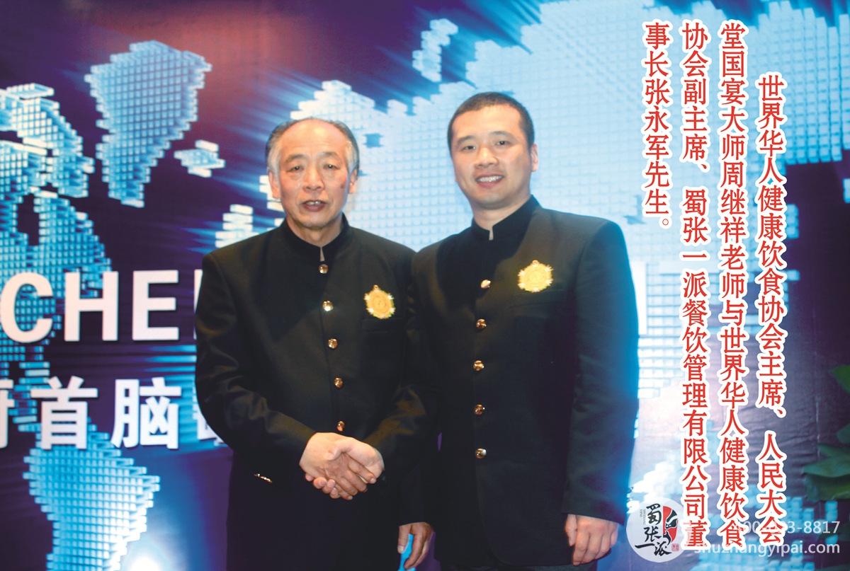 人民大会堂周继祥老师与蜀张一派董事长分别当选世界华人健康饮食协会主席和副主席